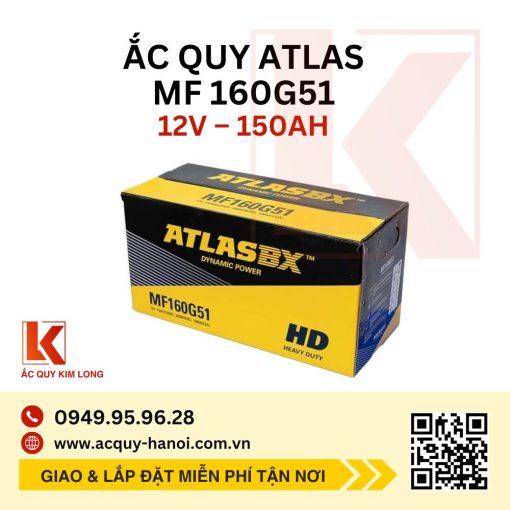 - Ắc quy Atlas MF160G51 12V – 150AH thuộc loại sản phẩm miễn bảo dưỡng với công nghệ cải tiến của hãng AtlasBX, đặc biệt là công nghệ tấm lưới X-Frame có ưu thế vượt trội về sự bền bỉ, tăng tuổi thọ và hiệu suất cho bình.